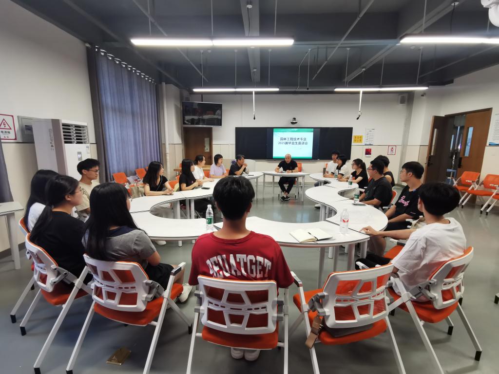 6月28日,园林工程技术专业在合鼎楼606室召开2025届毕业生座谈会,园林工程技术教研室全体老师及园林工程技术专业22级16名毕业生代表参加了座谈。