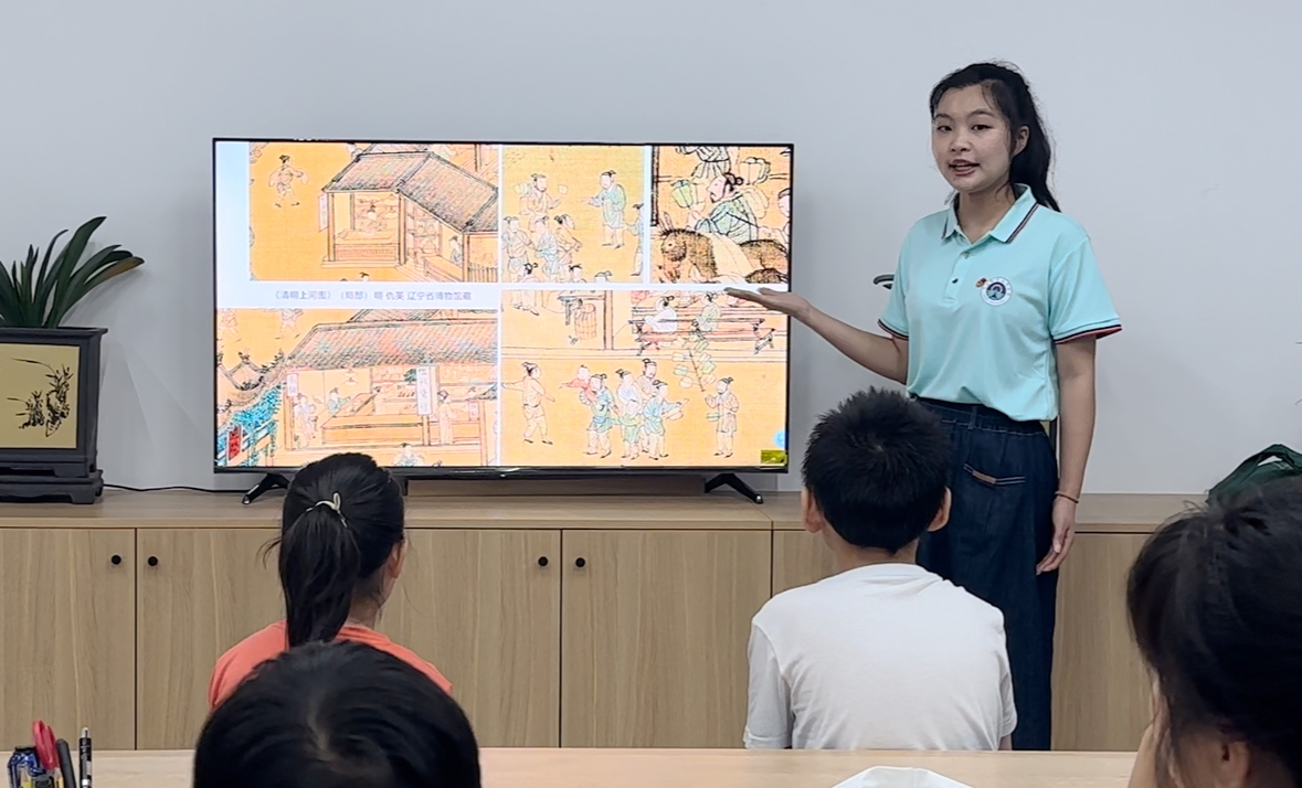 7月5日,追光志愿宣讲团分别前往贾鲁街社区和东尚社区持续开展宣讲活动。宣讲团带领青少年们共同赏析了《清明上河图》,这是史上仅有的、独一无二的风俗画文化瑰宝,是中国十大传世名画之一,其以严谨细致的笔法、全景式的构图,描绘了北宋都城东京(今河南开封)清明时节汴河两岸的风光以及各阶层人物的生活状况和社会风貌。通过队员们的讲解引导青少年们对中华优秀传统文化传承与发展产生深思与共鸣,坚定文化自信。最后宣讲团队员们抓住青少年兴趣特点,以《清明上河图》中的一角展示古人使用扇子降暑的故事,带领大家共同参与手绘团扇制作,指导和鼓励小朋友们发挥想象力,大胆尝试,像古人一样在团扇上画出一幅幅完美的作品。