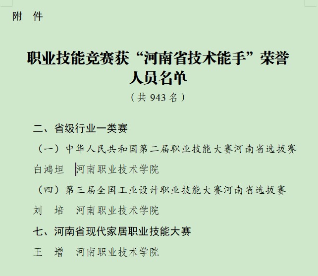 近日,由河南省人力资源和社会保障厅关于授予职业技能竞赛优秀选手河南省技术能手荣誉的决定中,数创学院教师刘培、王增和建筑室内设计专业学生白鸿坦分别荣获河南省技术能手称号。这是学院坚持高质量发展、持续以赛促教深化教育教学改革的重要成果,也是学院师生精湛技艺和顽强拼搏精神的生动体现。